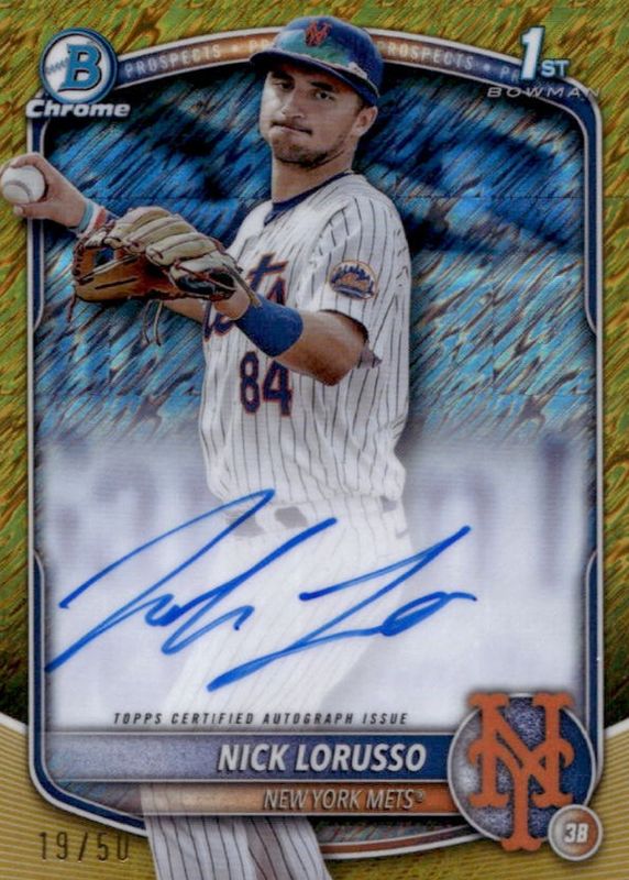 Nick Lorusso's Baseball cards are available in at least 1 sets. Nick Lorusso's biggest 7-day price movers are 2025 Bowman Chrome #CPA-NL Prospect Auto (1st), 2025 Bowman Chrome #CPA-NL Prospect Auto - Gold Shimmer Refractor /50 (1st), and 2025 Bowman Chrome #CPA-NL Prospect Auto - Orange Shimmer Refractor /25 (1st).