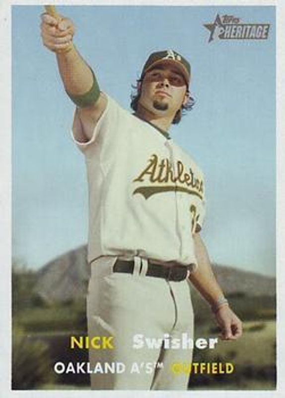 Nick Swisher's Baseball cards are available in at least 13 sets. Nick Swisher's biggest 7-day price movers are 2006 Topps Heritage #189 Base, 2007 Topps Heritage #CC-NS Clubhouse Collection Relics, and 2007 Topps Heritage #58a Base.
