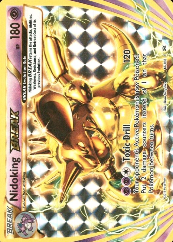 Nidoking BREAK's Pokemon cards are available in at least 1 sets. Nidoking BREAK's biggest 7-day price movers are 2016 XY: Evolutions #046/108 Holo.