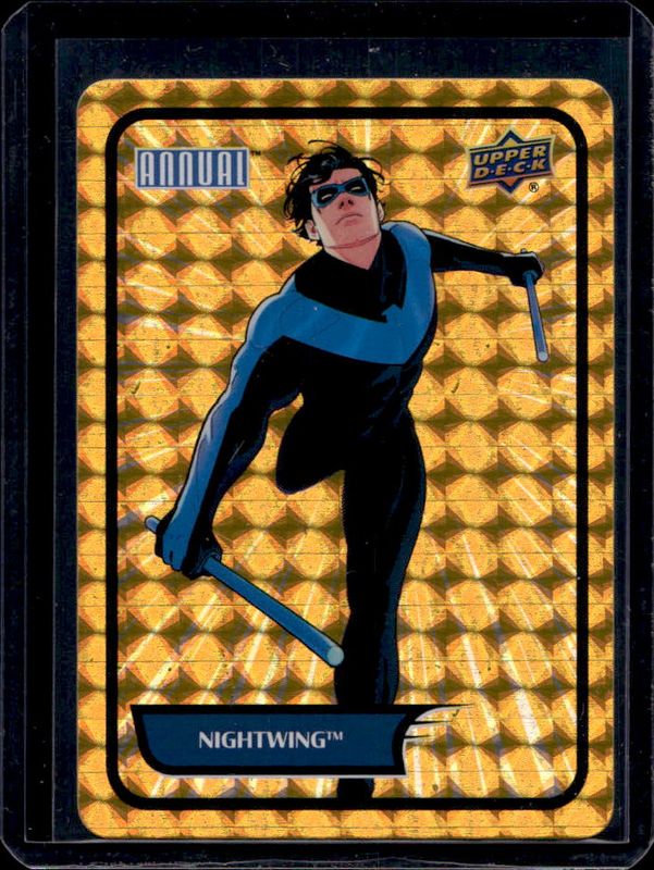 Nightwing's DC cards are available in at least 2 sets. Nightwing's biggest 7-day price movers are 2023 Upper Deck DC Annual #B-19 Backscatters - Gold, 2023 Upper Deck DC Annual #B-19 Backscatters, and 2023 Upper Deck DC Annual #BW-13 Beast World - Printing Plate /4.