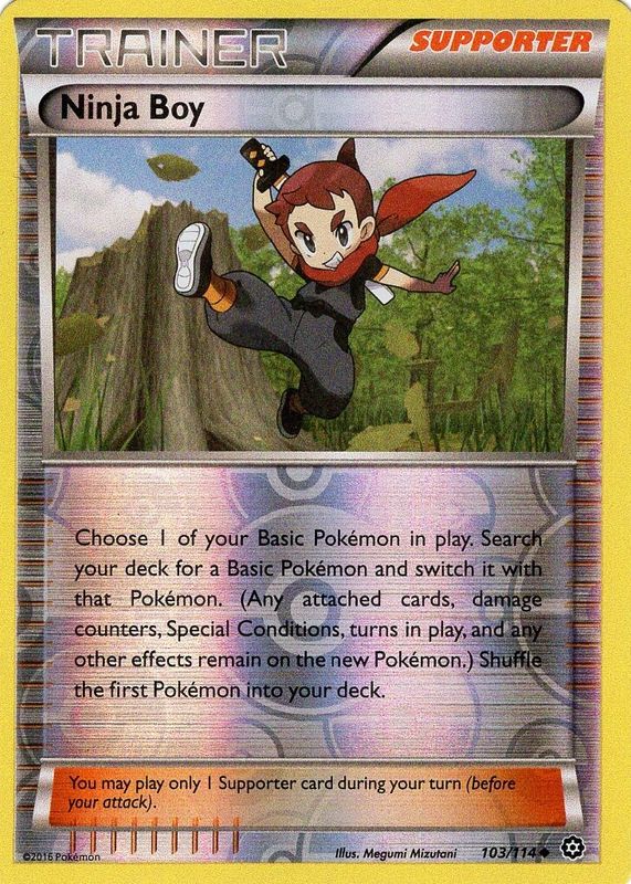Ninja Boy's Pokemon cards are available in at least 3 sets. Ninja Boy's biggest 7-day price movers are 2016 XY: Steam Siege #103/114 Reverse Holo, 2016 Japanese XY: Fever-Burst Fighter #053/054 1st Edition, and 2016 Japanese XY: Cruel Traitor #053/054 1st Edition.