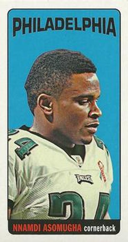 Nnamdi Asomugha's Football cards are available in at least 46 sets. Nnamdi Asomugha's biggest 7-day price movers are 2012 Topps #74 1965 - Mini, 2012 Topps #71 Printing Plates Black /1, and 2012 Topps #71 Platinum /1.