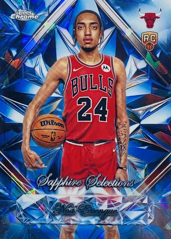 Noa Essengue's Basketball cards are available in at least 6 sets. Noa Essengue's biggest 7-day price movers are 2025 Topps #CM-NE Contemporary Marks, 2025 Topps #212 Gold /2025, and 2025 Topps Chrome #262 Pulsar Refractor.