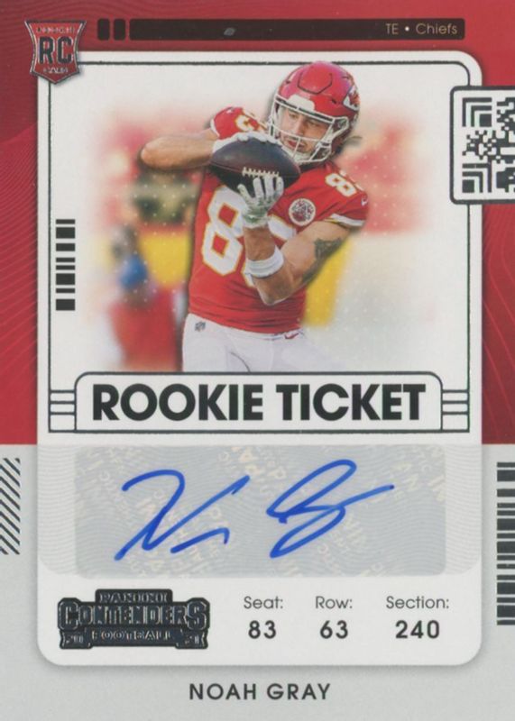 Noah Gray's Football cards are available in at least 1 sets. Noah Gray's biggest 7-day price movers are 2021 Contenders #219 Rookie Ticket Auto.