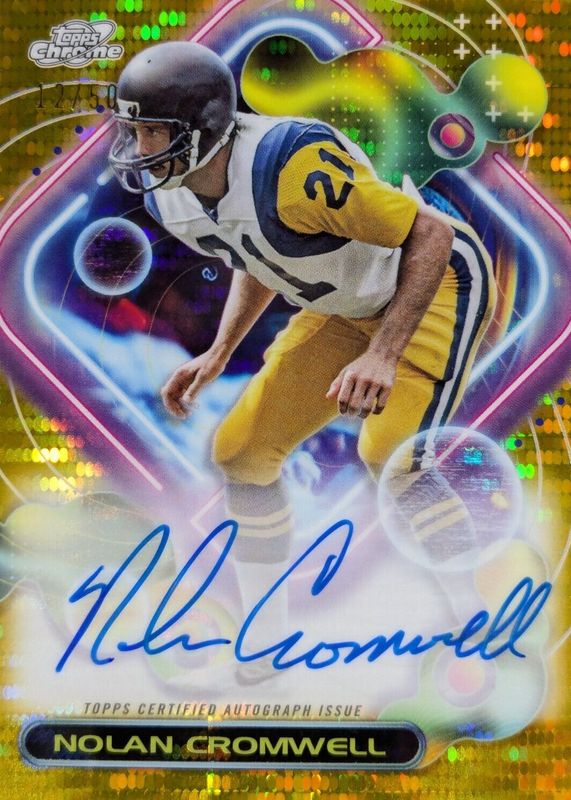 Nolan Cromwell's Football cards are available in at least 11 sets. Nolan Cromwell's biggest 7-day price movers are 2023 Topps Composite #CCA-NC Cosmic Autographs - Gold Interstellar /50, 2023 Topps Composite #CCA-NC Cosmic Autographs - Orange Galactic /25, and 2023 Topps Composite #CCA-NC Cosmic Autographs - Black Eclipse /10.
