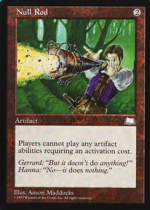 Null Rod's Magic: The Gathering cards are available in at least 1 sets. Null Rod's biggest 7-day price movers are 1997 Weatherlight Base.