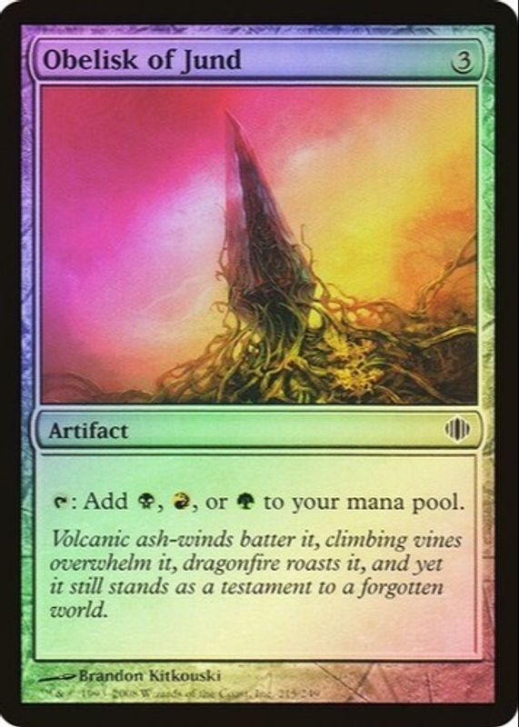 Obelisk of Jund's Magic: The Gathering cards are available in at least 1 sets. Obelisk of Jund's biggest 7-day price movers are 2008 Shards of Alara #215 Foil.