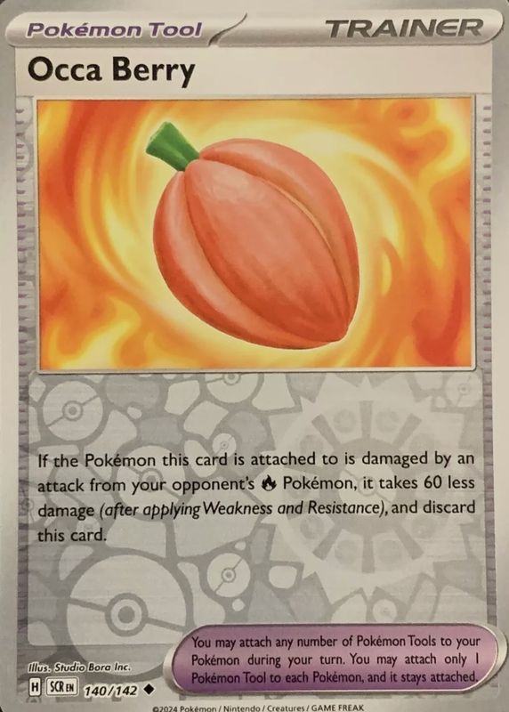 Occa Berry's Pokemon cards are available in at least 2 sets. Occa Berry's biggest 7-day price movers are 2024 Scarlet & Violet: Stellar Crown #140/142 Reverse Holo, 2024 Japanese Scarlet & Violet: Stellar Miracle #093/102 Base, and 2024 Scarlet & Violet: Stellar Crown #140/142 Base.
