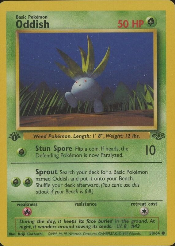 Oddish's Pokemon cards are available in at least 35 sets. Oddish's biggest 7-day price movers are 2024 Scarlet & Violet: Paldean Fates #092/091 Shiny Rare, 2023 Japanese Scarlet & Violet: Shiny Treasure ex #191/190 Shiny Rare, and 1999 Jungle #58/64 1st Edition.