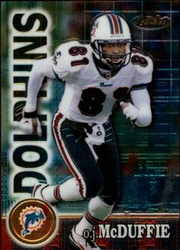 OJ McDuffie's Football cards are available in at least 72 sets. OJ McDuffie's biggest 7-day price movers are 2000 Topps Finest #123 Base /2400, 2000 Topps Finest #123 Gold Refractor /50, and 1996 Topps Laser #49 Base.