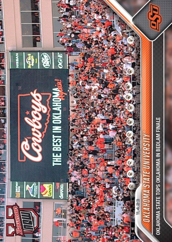 Oklahoma State University Football's Football cards are available in at least 1 sets. Oklahoma State University Football's biggest 7-day price movers are 2023 Bowman U Now #24 Base (Print Run: 607), 2023 Bowman U Now #24 Blue /49, and 2023 Bowman U Now #24 Purple /25.