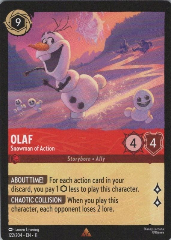 Olaf - Snowman of Action's Disney Lorcana cards are available in at least 1 sets. Olaf - Snowman of Action's biggest 7-day price movers are 2026 Winterspell #122/204 Base, and 2026 Winterspell #122/204 Cold Foil.
