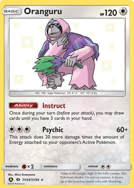 Oranguru's Pokemon cards are available in at least 13 sets. Oranguru's biggest 7-day price movers are 2020 Sword & Shield: Vivid Voltage #199/185 Holo (Secret), 2022 Sword & Shield: Brilliant Stars #TG12/TG30 Trainer Gallery, and 2019 Sun & Moon: Hidden Fates #SV44/SV94 Shiny Rare.