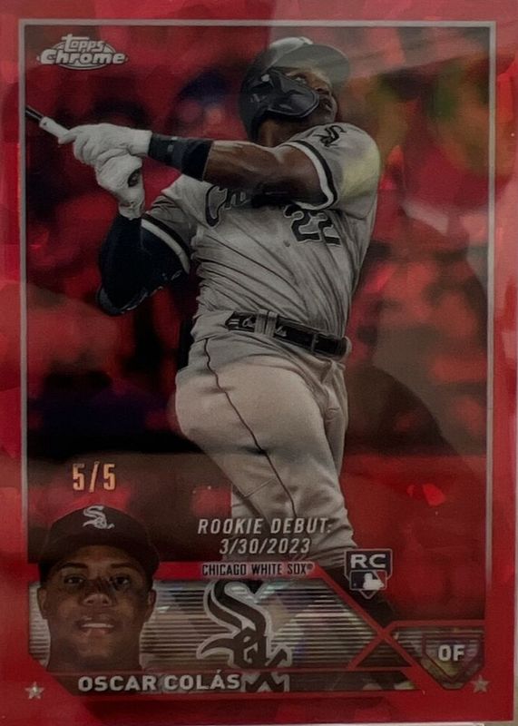 The biggest 30-day change Oscar Colas cards are 2023 Topps Chrome Update Sapphire Edition #USCS205 Rookie Debut - Red /5, 2022 Bowman Chrome #BCP-152 Prospects - Purple Refractor /250 (1st), and 2022 Bowman Chrome #BCP-152 Prospects - Red Shimmer Refractor /5 (1st).