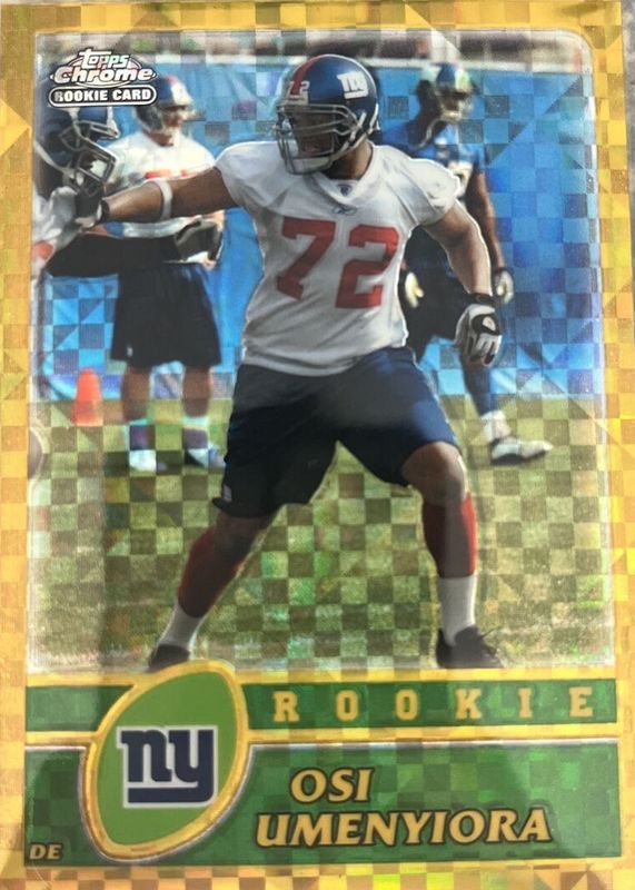 Osi Umenyiora's Football cards are available in at least 30 sets. Osi Umenyiora's biggest 7-day price movers are 2003 Topps Chrome #204 Gold X-Fractor /101, 2003 Bowman Chrome #158 Base, and 2003 Bowman Chrome #158 Refractor /500.
