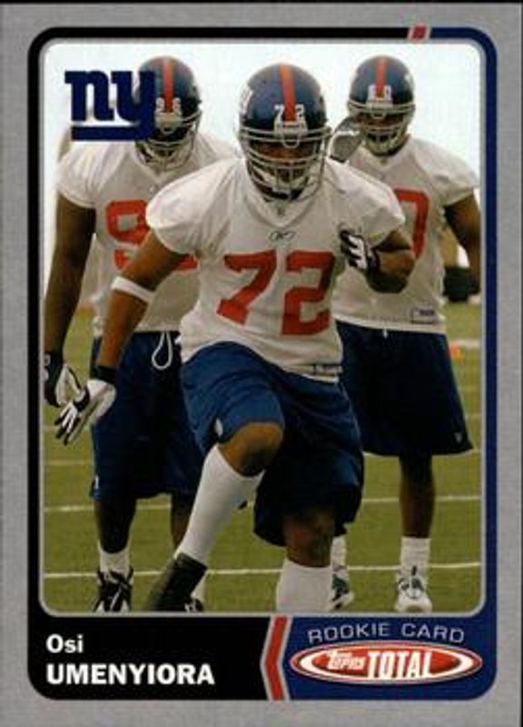 Osi Umenyiora's Football cards are available in at least 4 sets. Osi Umenyiora's biggest 7-day price movers are 2003 Topps Total #464 Silver, 2003 Topps Total #464 Base, and 2011 Score #195 Gold Zone.