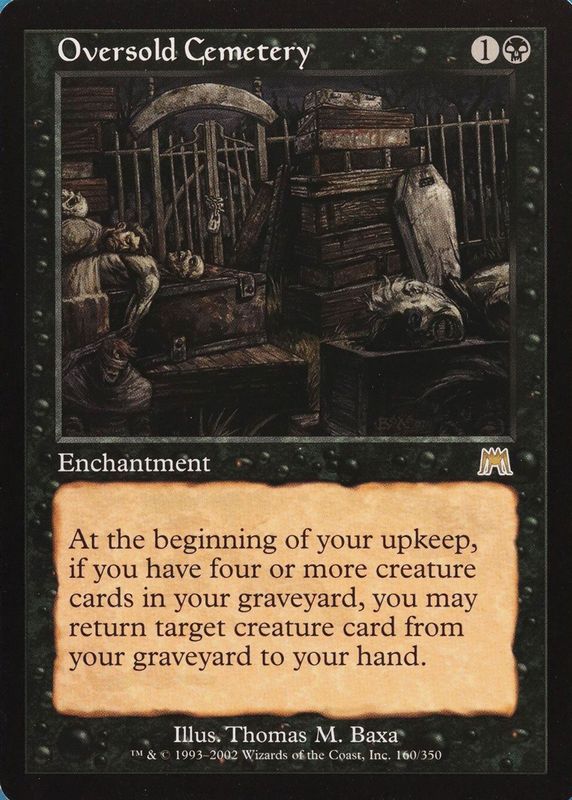 Oversold Cemetery's Magic: The Gathering cards are available in at least 1 sets. Oversold Cemetery's biggest 7-day price movers are 2002 Onslaught #160 Base, and 2002 Onslaught #160 Foil.