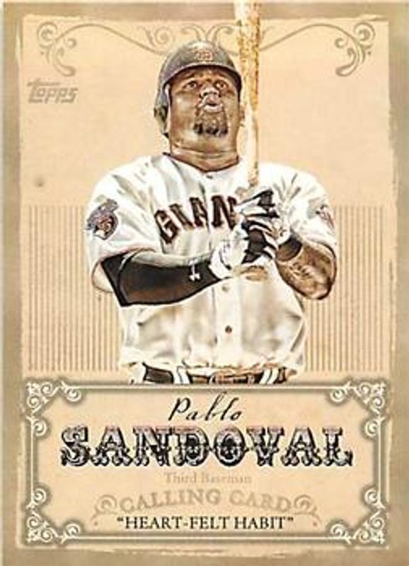 Pablo Sandoval's Baseball cards are available in at least 23 sets. Pablo Sandoval's biggest 7-day price movers are 2013 Topps #CC-14 Calling Cards, 2013 Topps #456 Gold /2013, and 2013 Topps #456 Black /62.