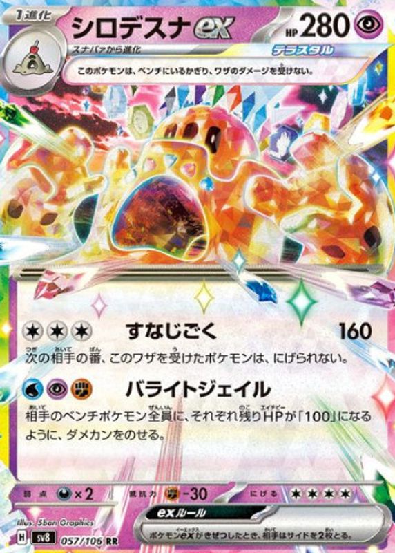Palossand ex's Pokemon cards are available in at least 2 sets. Palossand ex's biggest 7-day price movers are 2024 Japanese Scarlet & Violet: Super Electric Breaker #057/106 Double Rare, 2024 Japanese Scarlet & Violet: Super Electric Breaker #123/106 Super Rare (Full Art), and 2024 Scarlet & Violet: Surging Sparks #221/191 Ultra Rare (Full Art).