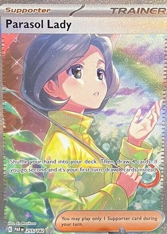 Parasol Lady's Pokemon cards are available in at least 2 sets. Parasol Lady's biggest 7-day price movers are 2023 Scarlet & Violet: Paradox Rift #255/182 Special Illustration Rare, 2023 Japanese Scarlet & Violet: Raging Surf #089/062 Special Art Rare, and 2023 Japanese Scarlet & Violet: Raging Surf #084/062 Super Rare.