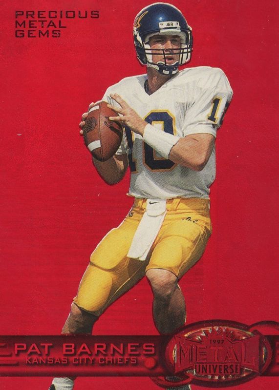 Pat Barnes' Football cards are available in at least 10 sets. Pat Barnes' biggest 7-day price movers are 1997 Metal Universe #194 Precious Metal Gems Red /135, 1997 Donruss #213 Press Proof Silver, and 2001 Topps XFL Gridiron Gear.
