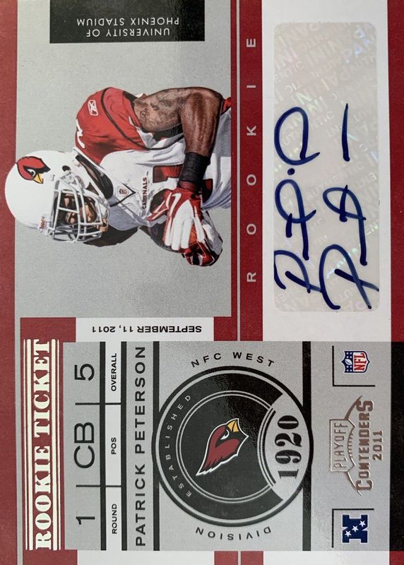 Patrick Peterson's Football cards are available in at least 7 sets. Patrick Peterson's biggest 7-day price movers are 2011 Contenders #199 Rookie Ticket Auto, 2011 Topps Magic Rookies #25 Base, and 2015 Panini Player of the Day #PP Autographs /75.