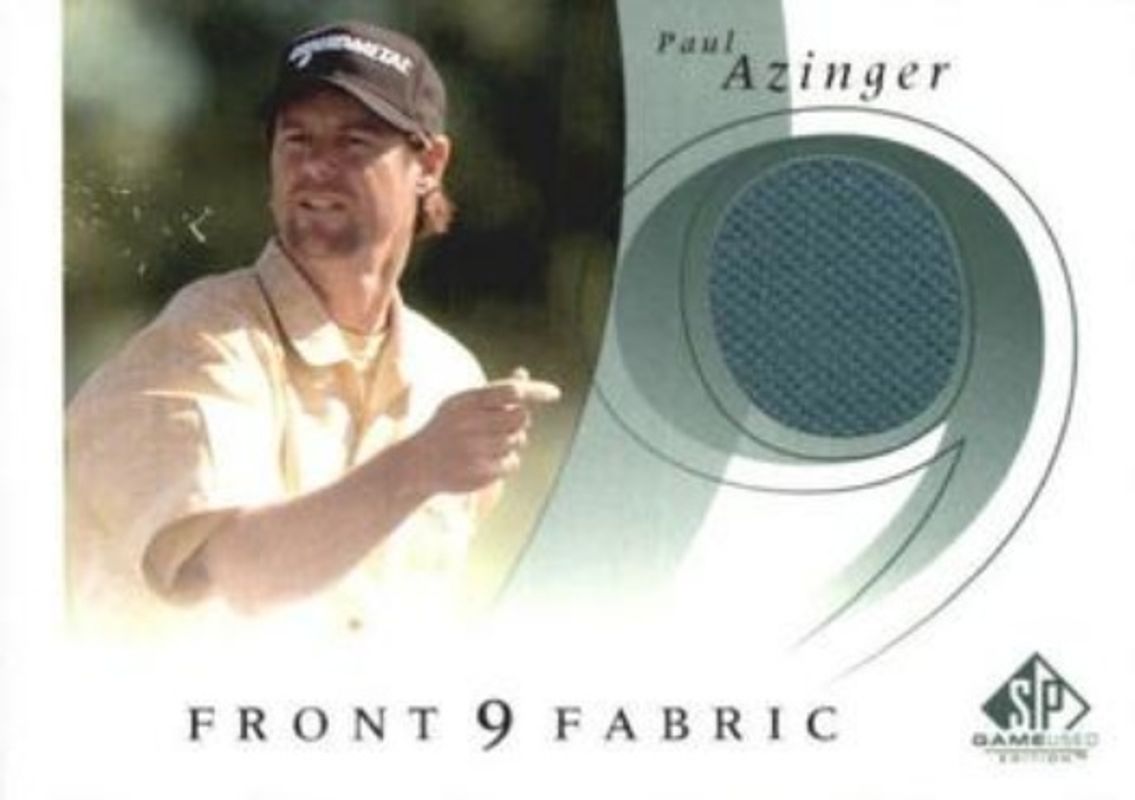 Paul Azinger's Golf cards are available in at least 5 sets. Paul Azinger's biggest 7-day price movers are 2002 SP Game Used #F9S-PA Front 9 Fabric, 2002 SP Game Used #34 Base /1750, and 2002 SP Game Used #F9S-PA Front 9 Fabric Autographs /375.