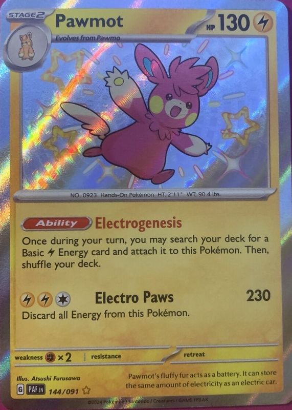 Pawmot's Pokemon cards are available in at least 8 sets. Pawmot's biggest 7-day price movers are 2023 Japanese Scarlet & Violet: Shiny Treasure ex #249/190 Shiny Rare, 2024 Scarlet & Violet: Paldean Fates #144/091 Shiny Rare, and 2023 Scarlet & Violet: Black Star Promo #SVP006 Build & Battle Box (Scarlet & Violet Base).