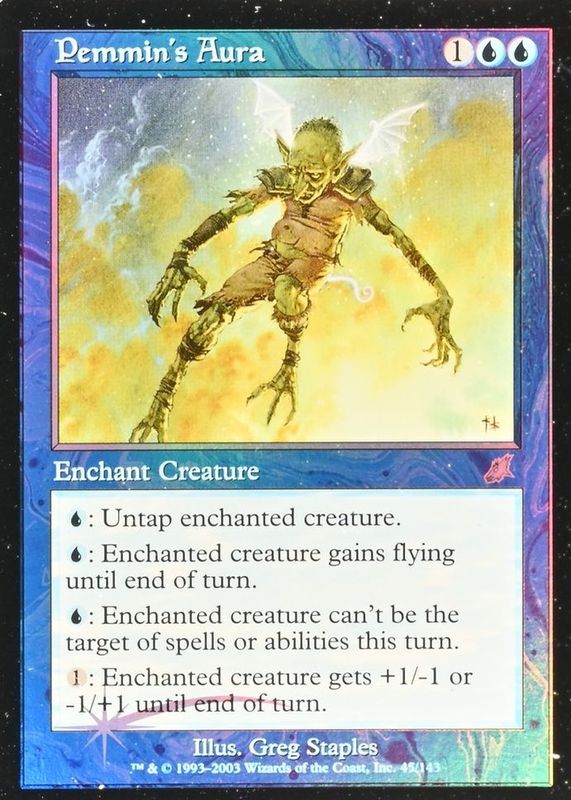 Pemmin's Aura's Magic: The Gathering cards are available in at least 1 sets. Pemmin's Aura's biggest 7-day price movers are 2003 Scourge #45 Foil, and 2003 Scourge #45 Base.