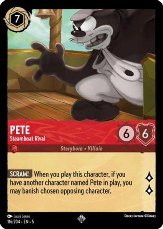 Pete - Steamboat Rival's Disney Lorcana cards are available in at least 1 sets. Pete - Steamboat Rival's biggest 7-day price movers are 2024 Shimmering Skies #116/204 Base, and 2024 Shimmering Skies #116/204 Cold Foil.