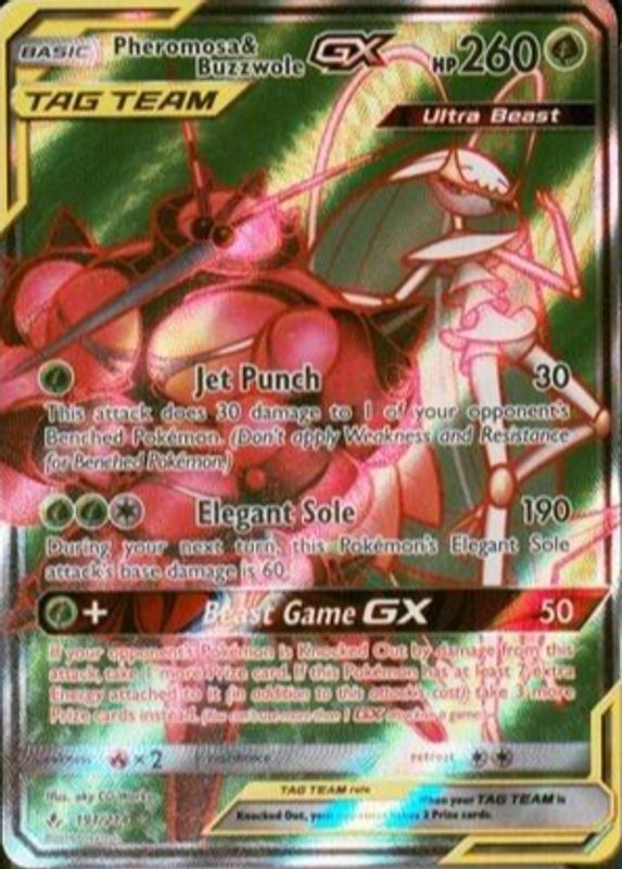 Pheromosa & Buzzwole GX's Pokemon cards are available in at least 2 sets. Pheromosa & Buzzwole GX's biggest 7-day price movers are 2019 Sun & Moon: Unbroken Bonds #001/214 Holo, 2019 Sun & Moon: Unbroken Bonds #192/214 Holo (Alternate Full Art), and 2019 Japanese Sun & Moon: Full Metal Wall #056/054 Super Rare.