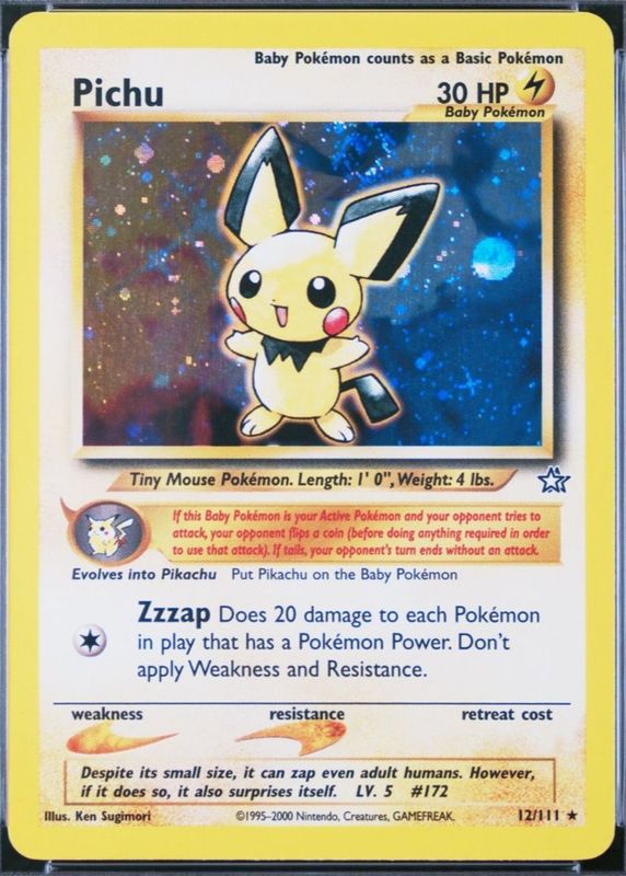 Pichu's Pokemon cards are available in at least 19 sets. Pichu's biggest 7-day price movers are 2008 Diamond & Pearl: Stormfront #045/100 Promo (Burger King Collection), 2000 Neo Genesis #12/111 Holo, and 2001 Wizards Black Star Promo #35 Pokemon League.