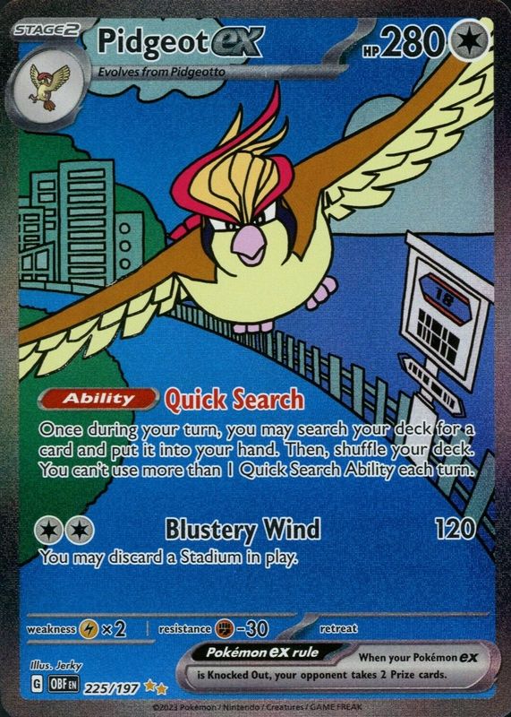 Pidgeot ex's Pokemon cards are available in at least 6 sets. Pidgeot ex's biggest 7-day price movers are 2023 Japanese Scarlet & Violet: Shiny Treasure ex #335/190 Shiny Super-Rare, 2023 Scarlet & Violet: Obsidian Flames #164/197 Double Rare, and 2023 Scarlet & Violet: Obsidian Flames #225/197 Special Illustration Rare.