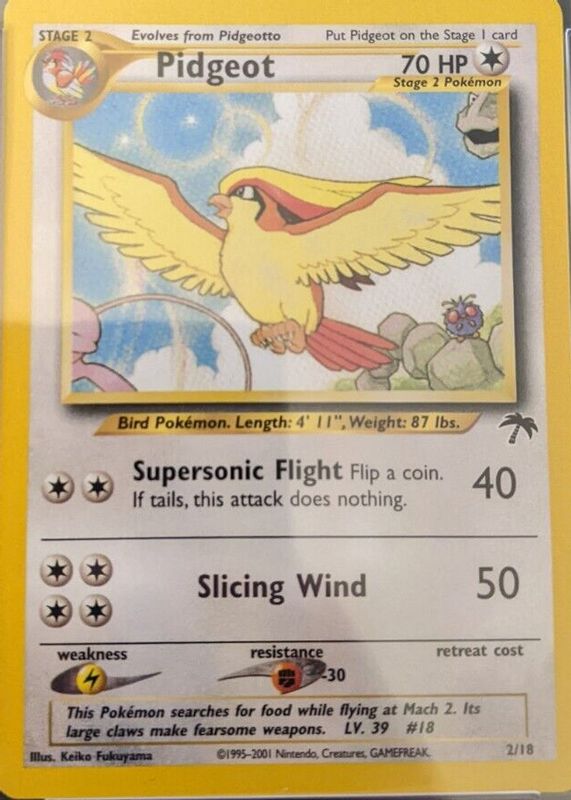 Pidgeot's Pokemon cards are available in at least 24 sets. Pidgeot's biggest 7-day price movers are 2011 Call of Legends #30/95 Base, 2000 Base Set 2 #14/130 Holo, and 2006 EX: Holon Phantoms #014/110 Holo.