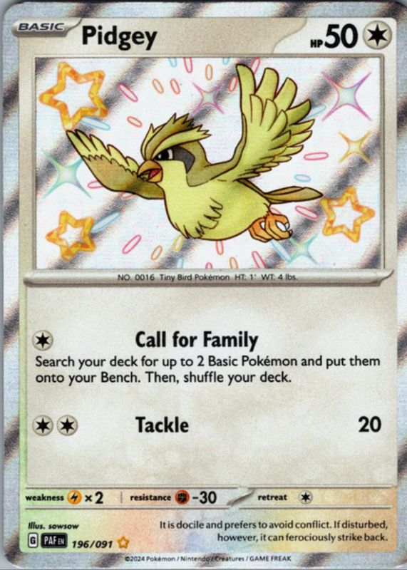 Pidgey's Pokemon cards are available in at least 26 sets. Pidgey's biggest 7-day price movers are 2023 Japanese Scarlet & Violet: Shiny Treasure ex #304/190 Shiny Rare, 2023 Japanese Scarlet & Violet: Ruler of the Black Flame #118/108 Art Rare, and 2024 Scarlet & Violet: Paldean Fates #196/091 Shiny Rare.