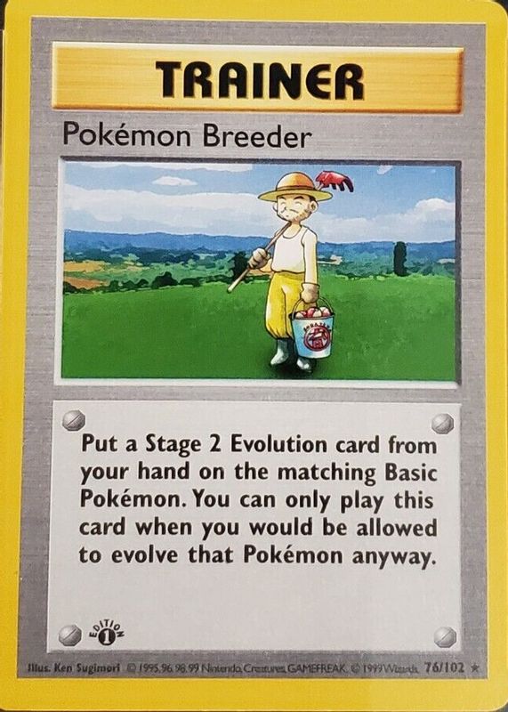 Pokemon Breeder's Pokemon cards are available in at least 5 sets. Pokemon Breeder's biggest 7-day price movers are 1999 Pokemon Game #76 1st Edition, 1999 Pokemon Game #76 Shadowless, and 2002 Legendary Collection #102 Reverse Holo.