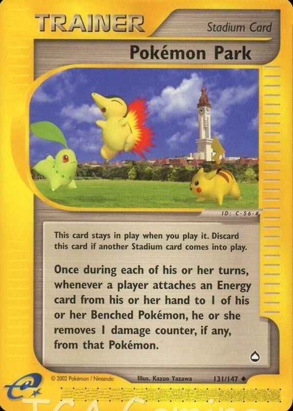 Pokemon Park's Pokemon cards are available in at least 3 sets. Pokemon Park's biggest 7-day price movers are 2003 Aquapolis #131/147 Base, 2005 POP Series 2 #10/17 Base, and 2003 Aquapolis #131/147 Reverse Holo.