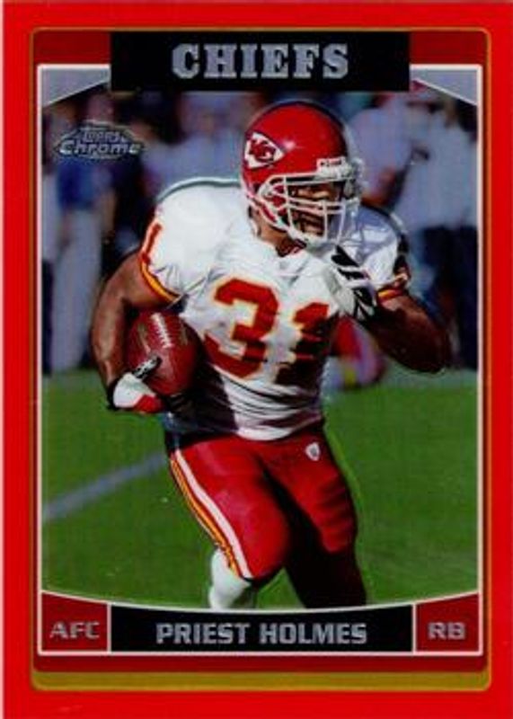 Priest Holmes' Football cards are available in at least 102 sets. Priest Holmes' biggest 7-day price movers are 2006 Topps Chrome #141 Red Refractor /259, 2006 Topps Chrome #141 Printing Plates Black /1, and 2006 Topps Chrome #141 Printing Plates Cyan /1.