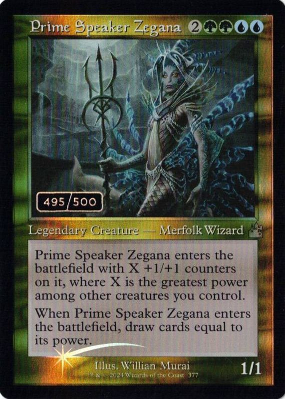 Prime Speaker Zegana's Magic: The Gathering cards are available in at least 2 sets. Prime Speaker Zegana's biggest 7-day price movers are 2024 Ravnica Remastered #377 Retro Frame /500, 2013 Gatecrash #188 Base, and 2024 Ravnica Remastered #0377 Retro Frame /500.