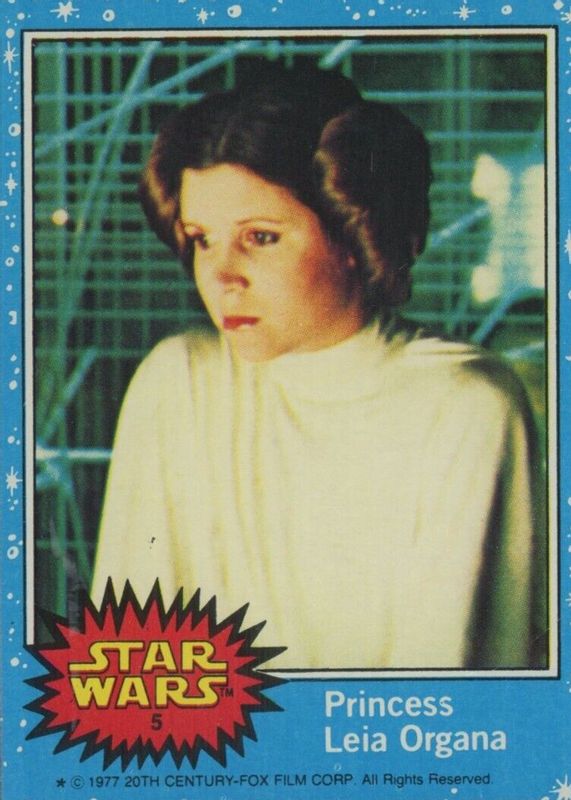 Princess Leia Organa's Star Wars cards are available in at least 5 sets. Princess Leia Organa's biggest 7-day price movers are 1977 Topps #5 Base, 2023 Topps Chrome Star Wars Galaxy #82 Mojo Refractor /50, and 2023 Topps Chrome Star Wars Galaxy #82 Prism Refractor /75.