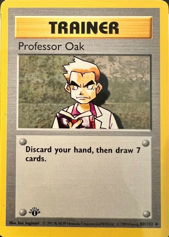 Professor Oak's Pokemon cards are available in at least 2 sets. Professor Oak's biggest 7-day price movers are 1999 Pokemon Game #88 1st Edition, 1996 Japanese Base Set Base - No Rarity Symbol, and 1999 Pokemon Game #88 Unlimited.