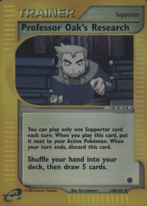 Professor Oak's Research's Pokemon cards are available in at least 2 sets. Professor Oak's Research's biggest 7-day price movers are 2002 Expedition #149/165 Reverse Holo, 2006 EX: Dragon Frontiers #080/101 Base, and 2006 EX: Dragon Frontiers #080/101 Reverse Holo.