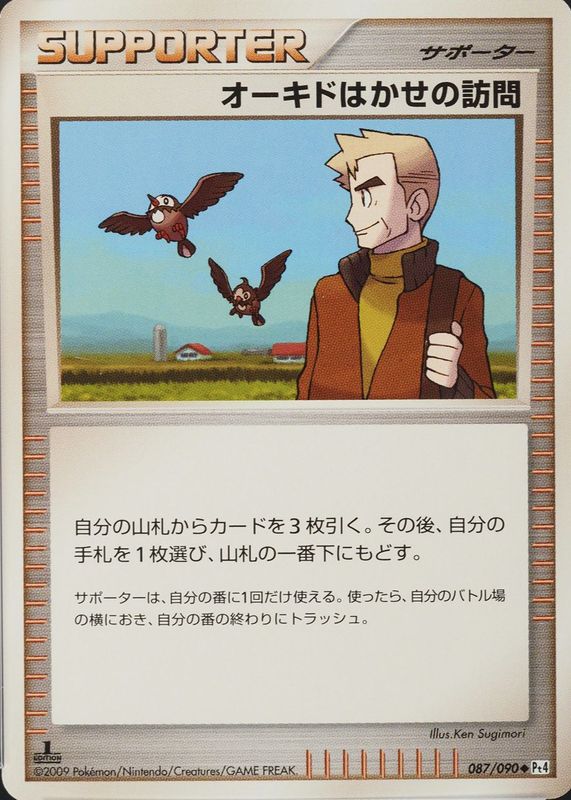 Professor Oak's Visit's Pokemon cards are available in at least 3 sets. Professor Oak's Visit's biggest 7-day price movers are 2009 Japanese Platinum: Advent of Arceus #087/090 1st Edition, 2009 Japanese Platinum: Advent of Arceus #087/090 Unlimited, and 2007 Diamond & Pearl: Secret Wonders #122/132 Base.