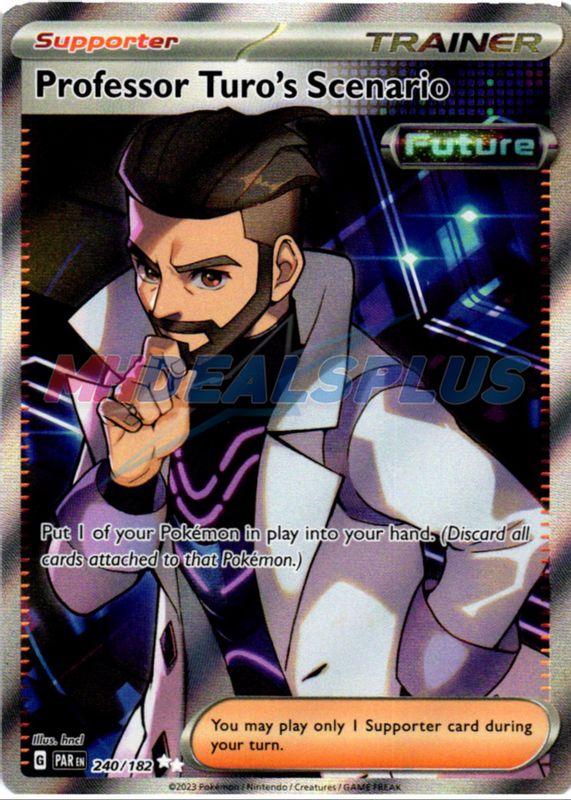 Professor Turo's Scenario's Pokemon cards are available in at least 3 sets. Professor Turo's Scenario's biggest 7-day price movers are 2023 Scarlet & Violet: Paradox Rift #257/182 Special Illustration Rare, 2023 Scarlet & Violet: Paradox Rift #240/182 Ultra Rare, and 2024 Japanese Scarlet & Violet: Terastal Fest ex #175/187 Base.