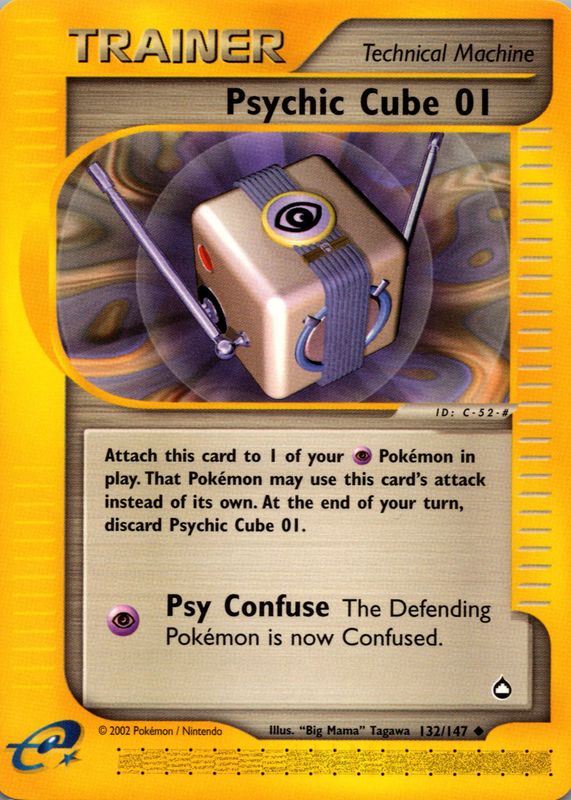 Psychic Cube 01's Pokemon cards are available in at least 2 sets. Psychic Cube 01's biggest 7-day price movers are 2003 Aquapolis #132/147 Base, 2003 Aquapolis #132/147 Reverse Holo, and 2002 Japanese The Town on No Map #84/92 1st Edition.