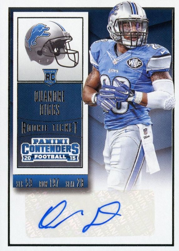 Quandre Diggs' Football cards are available in at least 4 sets. Quandre Diggs' biggest 7-day price movers are 2015 Contenders #257 Rookie Ticket Auto, 2019 Panini Instant #195 NFL Playoffs, and 2019 Panini Instant #195 NFL Playoffs - Black /1.