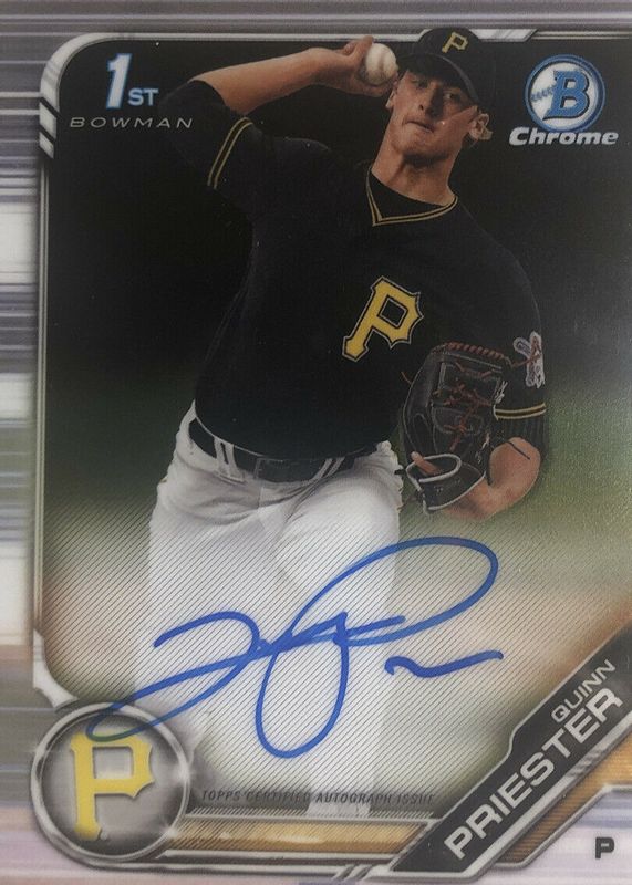 Quinn Priester's Baseball cards are available in at least 23 sets. Quinn Priester's biggest 7-day price movers are 2019 Bowman Draft #CDA-QP Chrome DP Auto (1st), 2024 Topps Chrome #55 Base, and 2019 Bowman Draft #CDA-QP Chrome DP Auto - Gold Refractor /50 (1st).