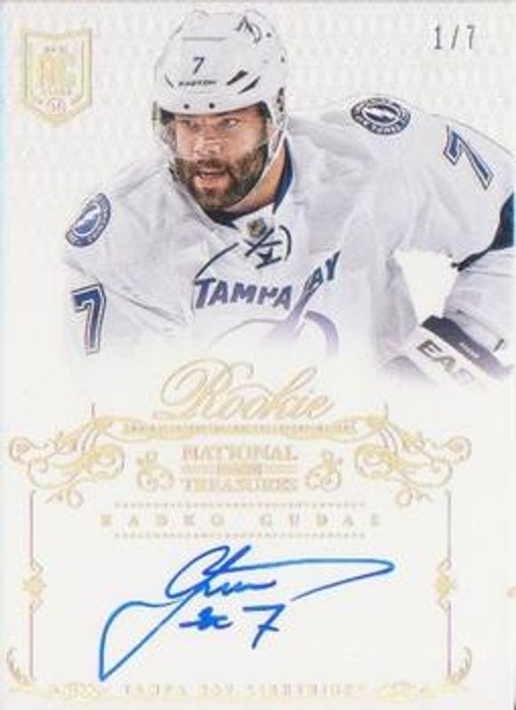Radko Gudas' Hockey cards are available in at least 19 sets. Radko Gudas' biggest 7-day price movers are 2013 National Treasures #119 Rainbow /21, 2013 National Treasures #119 Emerald /5, and 2013 National Treasures #119 Black /1.