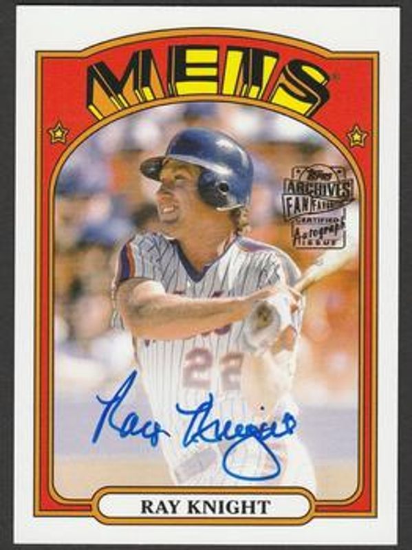 Ray Knight's Baseball cards are available in at least 17 sets. Ray Knight's biggest 7-day price movers are 2022 Topps Archives #72FF-RK Fan Favorites Autographs, 2022 Topps Archives #72FF-RK Fan Favorites Autographs - Gold /1, and 2022 Topps Archives #72FF-RK Fan Favorites Autographs - Purple /150.