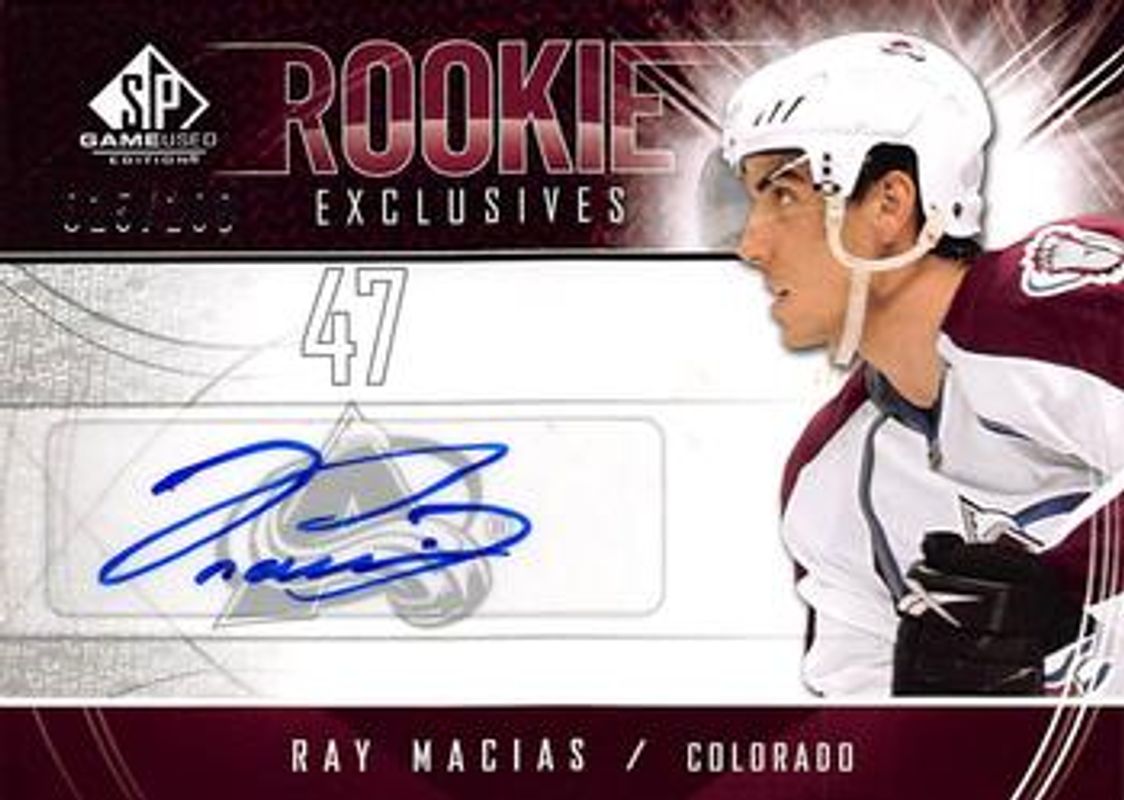 Ray Macias' Hockey cards are available in at least 5 sets. Ray Macias' biggest 7-day price movers are 2009 SP Game Used #RE-RM Rookie Exclusives Autographs /100, 2009 SP Game Used #123 Gold Spectrum /1, and 2009 SP Game Used #123 Gold /50.
